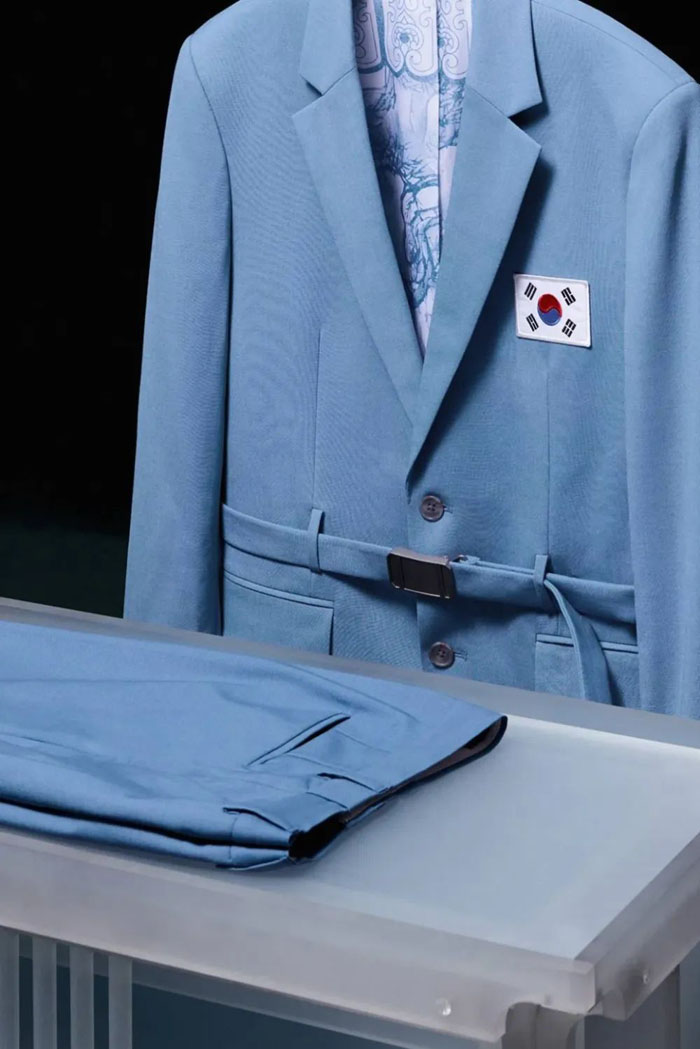 亚洲的另外一位邻居韩国,今年的礼服,则由本土时尚品牌Musinsa设计。“很东方”,成了它给许多人留下的最大印象。全身碧蓝色的西装设计,内里用水墨画风格描摹了竹子与祥云,的确充满了东方韵味。