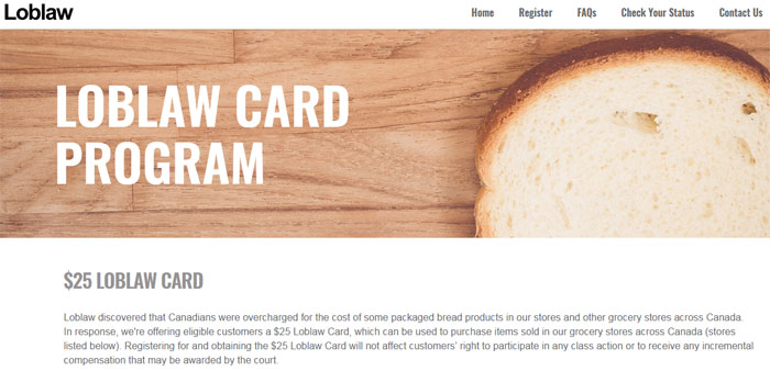 Loblaws称,加拿大人在其加拿大各地的商店中所购买的包装面包时被多收了费用。作为回应,Loblaws向符合条件的客户提供价值$25的Loblaw礼品卡,可用于购买其在加拿大各地的商店(下面列出的商店)中所出售的食品。