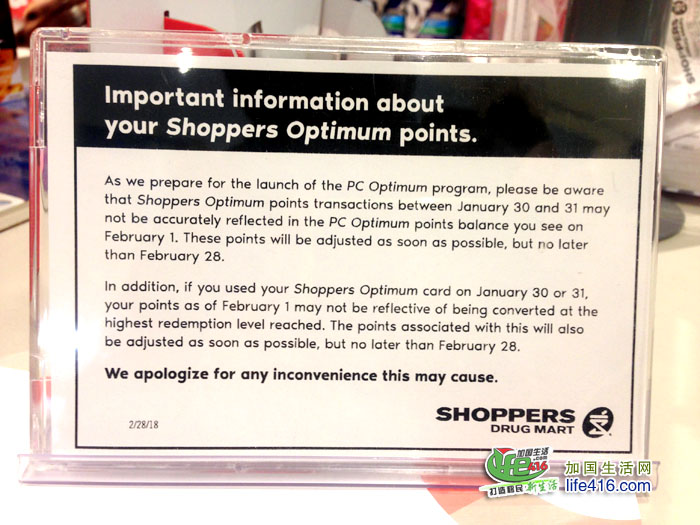 魁省的Shoppers店目前使用Pharmaprix的名字,Pharmaprix Optimum会员计划将于2018年1月31日终止,所有会员必须在明年5月2日之前兑换积分,也可选择将积分换算成等值的新会员卡积分。
