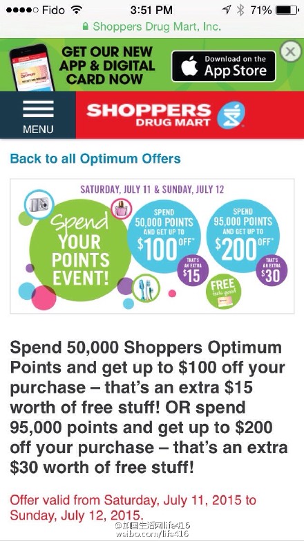 —— 加国生活网小编2015年7月9日最新爆料:大家有没有发现ShoppersDrugMart 今年以来购物积分或者用积分换商品的活动明显比去年少了,因此本周末SHOPPERS 有积分换商品的活动一定不要错过 ,5万点换$100,平时只能换$85;9万5 换$200 ,平时只能换$170 。有SDM积分的朋友们一定不要错过,所换的商店不包括TTC 车票、Gift卡、彩票、邮票。
