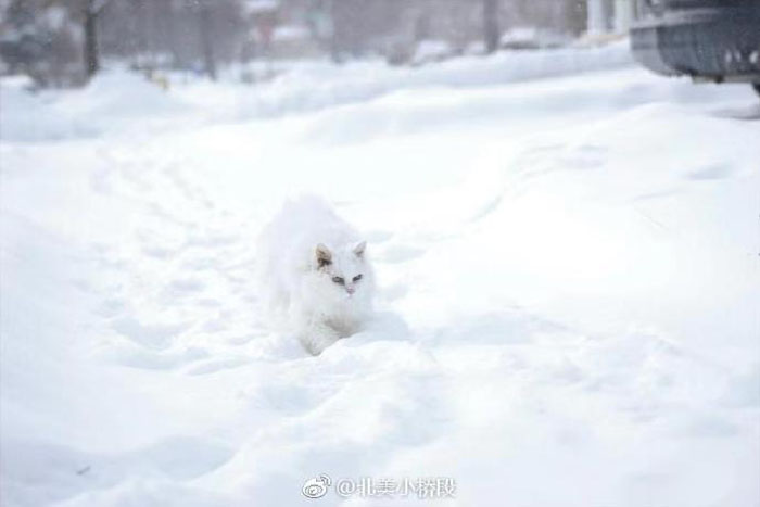 大猫现在真的很老了,出门溜达的时间短了挺多。最近雪很大,她在院子里踏雪两圈,就回来了。