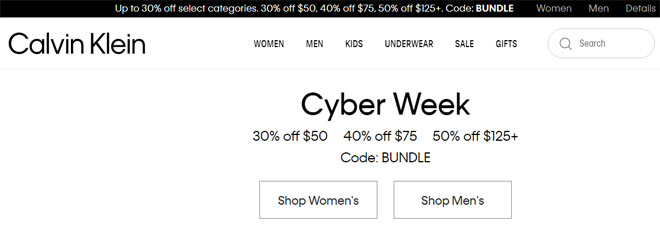 而Calvin Klein网店的促销力度是:满$50 打7折,满$75打6折,满$125以上打5折,详情请点击这里:https://www.calvinklein.ca/en