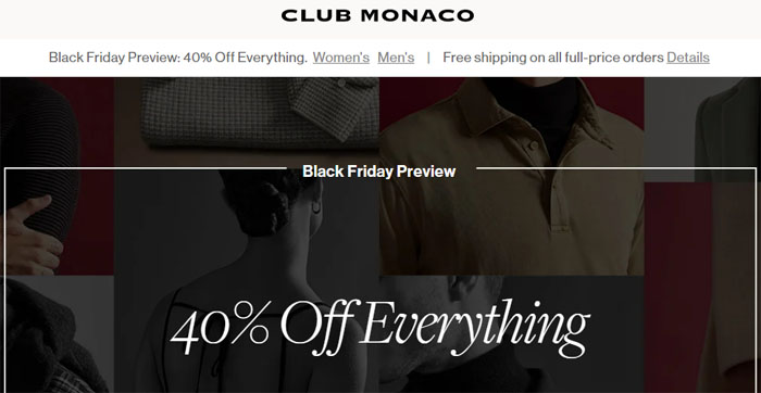 Club Monaco也提前进入黑五促销模式,无论实体店还是网店全部都是40% off。