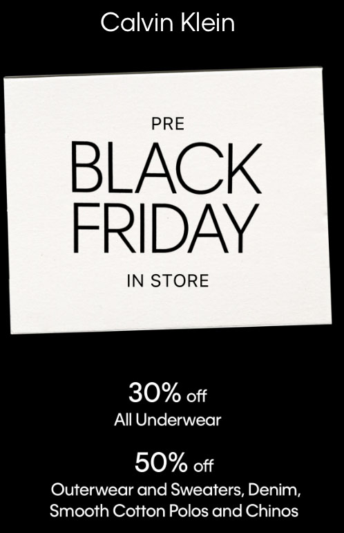 Calvin Klein Canada 店内Pre Black Friday已经从11月15日开始了,店内所有内衣立减 30%,所有外套和毛衣、Polo衫等立减50%,感兴趣的朋友不妨去店内看看。