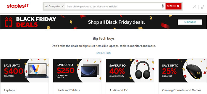 Staples已经提前一周开始进行黑五促销活动,并承诺黑五当天优惠价格不会再降,而且还会不断添加新优惠的商品。该店推出的黑五DEAL包括笔记本电脑优惠up to $400、iPad和平板电脑优惠up to $250、音响和电视优惠up to 40% off;电脑配件和游戏机优惠up to 25% off。