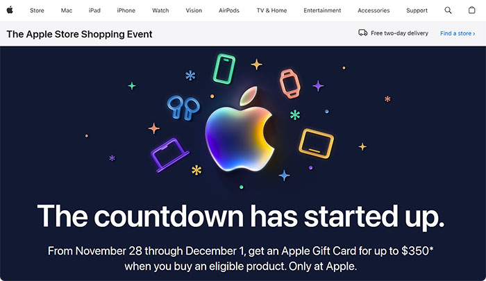 【加国生活网】疫情前的苹果Apple很少在黑五搞促销,疫情后则不一样了,去年黑五的打折力度就挺大,今年的打折力度更大,从11月28日至12月1日,凡是在Apple Store购买指定商品,将会获得一张up to $350的Apple礼品卡,供日后使用。更多详情请点击官网:https://www.apple.com/ca/shop/gifts/shopping-event