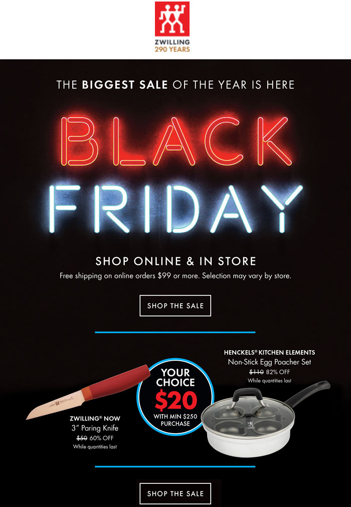 双立人厨具的黑五促销是从即日起至11月28日,所有商品优惠up to 75% off,一次性购物满$99免运费,详情请点击这里到网站查询。加国生活网小编友情提示:促销是up to 75% off,而不是直接全店25折,也就是说有些商品没有25折,有些是5折、4折等等,最高至25折。