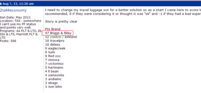 北美著名的航空旅行论坛flyertalk 曾有一篇关于行李箱的讨论帖(原帖Best Luggage),有人从近500 篇回复中作出统计,好评加1分,评价中庸的不计分,差评减1分,最终统计结果见下图,Briggs & Riley 以最高分遥遥领先。
