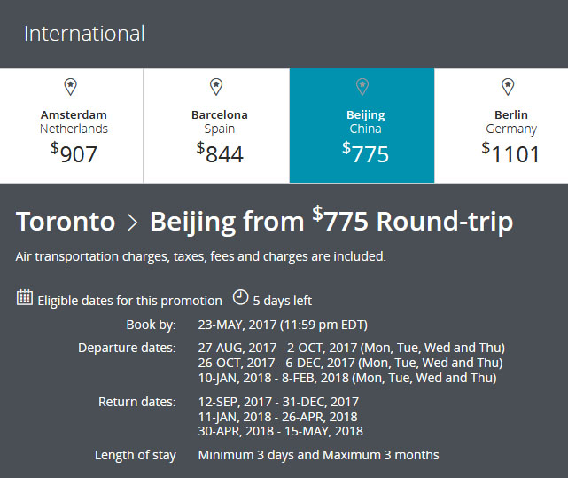 【加国生活网】如果你错过Air Canada加航前几天推出的特价机票的话,不用着急,加航在维多利亚日长周末又推出特价促销了:多伦多飞北京往返$775起。小编仔细研究了一下他们的特价要求: