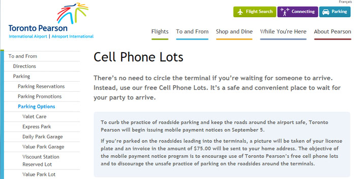 相信住在大多伦多地区的许多人都有到皮尔逊国际机场(Toronto Pearson International Airport)接机的经历。由于机场大楼门前不允许停车太久(超过5分钟就会有警察出现警告快把车开走),而机场停车费又特别贵,所以许多人开车到达机场前,将车停在马上到达机场的道路两边,人坐在车里,等亲朋好友出关取了行李后,再开到机场大楼门前用几分钟时间接人。