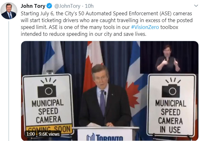 【加国生活网编译报道】多伦多市长庄德利(John Tory)在2020年6月26日宣布,50个超速摄像机(Automated Speed Enforcement,简称ASE)将于7月6日星期一正式启用,届时会毫不留情地向超速司机发罚款单,就算超1公里也要罚。