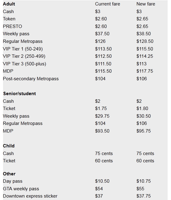 从2013年1月1日起,公车代币(Token)将从现价$2.6 涨5分至$2.65;Presto 储蓄卡的单次收费也从现价$2.6 元涨至$2.65元;周票(Weekly Pass)从现价$37.5 涨至$38.5;月票(Regular Metropass)从现价$126 涨至$128.5;学生月票(Post-secondary Metropass)和老人月票都从现价$104 涨至$106;Day Pass 从现价$10.5 涨至$10.75。