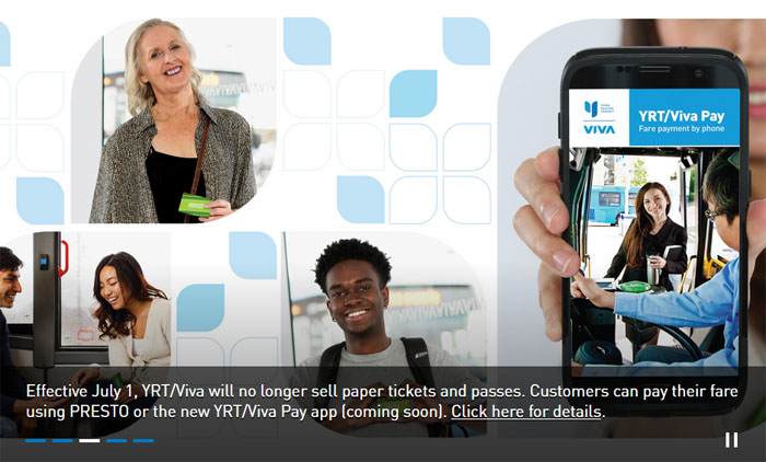 【加国生活网综合报道】从2017年7月1日起,约克区公交系统(YRT及Viva)将会进行一系列调整,将停止出售纸车票或纸月票,乘客必须用专门的手机APP在线购票或使用Presto卡充值后乘车,当然也可以用现金在上车时购票。交通局希望新科技的使用,将更方便乘客,鼓励民众更多使用公交系统。