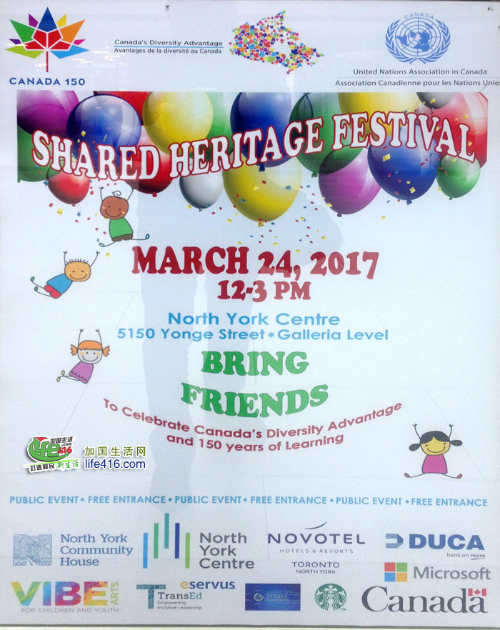做为“加拿大多元文化优势项目”的一部分,Shared Heritage Festival共享遗产节于2017年3月24日在北约克中心成功举行,各个族裔的人士欢聚在一个屋檐下,共同庆祝加拿大的多元文化。该活动也让几个月的青年领导力培训的课堂教学达到顶峰。