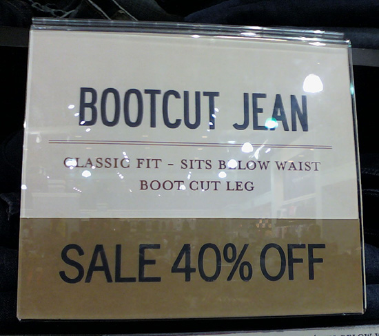 这种就是经典款式( Classic Fit )卡裆或是低裆( Sits Below Waist )喇叭口(Boot Cut Leg)牛仔裤。看到没,经典款式不见得就是高裆裤,也有低裆裤的。