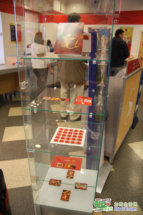 邮局里的中间,专门专了一个大的玻璃柜,把今年生肖邮票的部分邮品展示出来。2012年新增邮品的亮点:增加了龙年和兔年合在一起的Souvenir Sheet;增加了内含六张国内版本龙票小本票(Booklet of 6,信用卡大小,携带方便)。