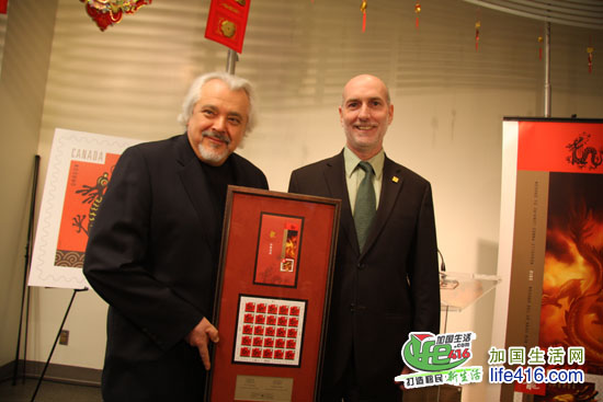 为感谢龙年邮票设计师Louis Fishauf 的努力工作,Jim Phillips 代表加拿大邮局向Louis Fishauf 赠送纪念礼品。