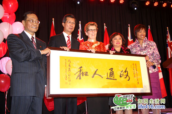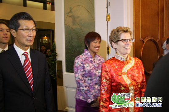 【加国生活网专稿】2013年2月11日大年初二晚,安省新上任的首位女省长韦恩(Kathleen Wynne)率领部分内阁成员出席在烈治文山钓鱼台国宴举办的华裔社区庆祝蛇年春节晚宴,与各个族裔的省民一起共同庆祝中华民族的传统节日春节。