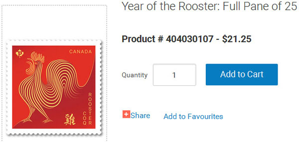 加拿大国内邮资的鸡年邮票,单张0.85,一联25张是$21.25