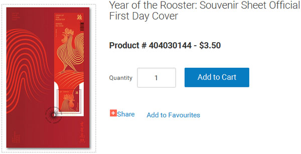 加拿大国际邮资的鸡年邮票,单张$2.5
