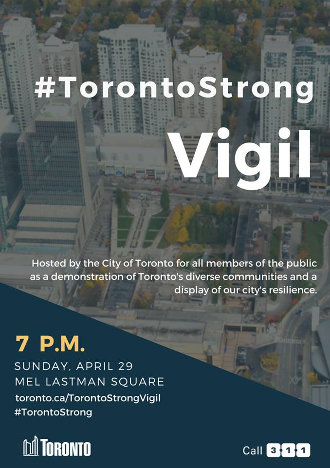 最新消息(4月29日晚7点):多伦多市政府将于4月29日晚7点在Mel Lastman Square举行Toronto Strong Vigil 守夜活动,加拿大总理、安省省长、多伦多市长都会出席,纪念在此次事件中死去的10人。多伦多市长John Tory在周六发布Twitter 表示,多伦多将向世界展示这座城市是如何面对如此惨痛的事件。面对悲剧,多伦多各个族裔的市民纷纷表达了哀思,鲜花铺满了广场,由多伦多市府发起的Toronto Strong捐款活动目前已经收到近180万的善款,筹款目标200万,详情请点击这里。