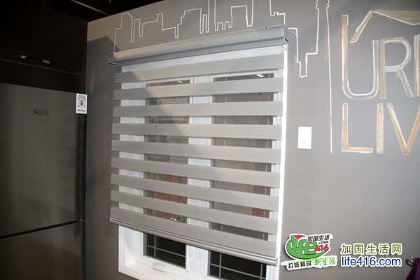 除了可画画的墙壁外,这个窗帘是由马达控制着,可通过开关控制窗帘的明暗程度,就是前后两层纱的上的灰色条纹的不同组合,让阳光达到不同效果的渐变组合。