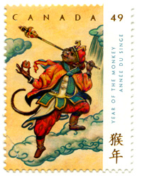 怎么样,挺正宗的吧,加拿大人也不含糊,2004年猴年的生肖票还是以孙悟空为题材的呢(看到没有,猴年的邮资是0.49),这只是扫描后的图片,真正的猴票是以凸凹的金边描绘而成,十分精致。