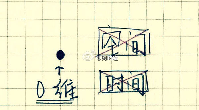让我们从一个点开始,和我们几何意义上的点一样,它没有大小、没有维度。它只是被想象出来的、作为标志一个位置的点。它什么也没有,空间、时间通通不存在,这就是零维度。