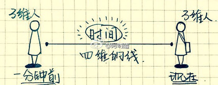 想象一下,左边有一个1分钟之前的我,右边则是现在我,将这“两个我”看成两个点,穿过他们连线,它就是四维空间里的线。太棒了,四维空间出现了!