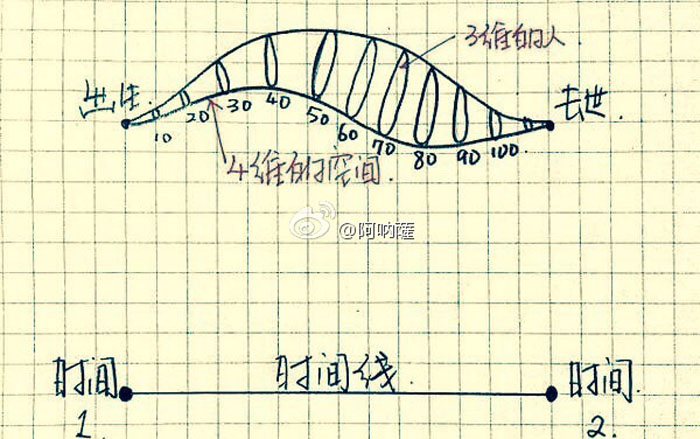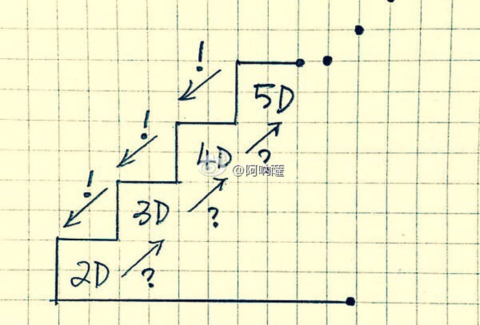 这里我来总结一下,回顾上文,从零维到四维,我们经历了点、线、面、体这个升级流程。然后四维空间又可以看做一点,充满着三维空间中所有可能性的连线,这个连线就是时间。