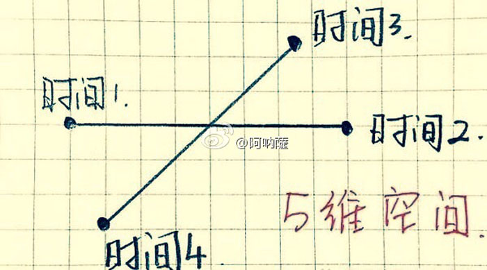 假如我们是四维空间生物,我们就可以看到过去、现在、将来各个时段的我们自己。但是,时间线只有一条,还记得前文中两条线交叉,将一维升级为二维么?那么现在,在四维这条时间线的基础上,我再加一条时间线和这条时间线交叉,五维空间就出现了!