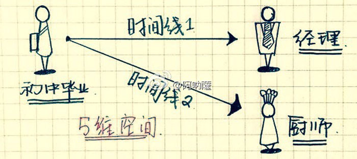 不懂?没关系!例子举起来!比如说,你大学毕业参加工作,工作了5年,现在是一名经理,那么四维空间里你只能看到大学毕业的你以及成为白领的这条时间线上的你。如果当初你初中毕业就去学烹饪,现在是一名厨师。那么这就是另一条时间线上的你。