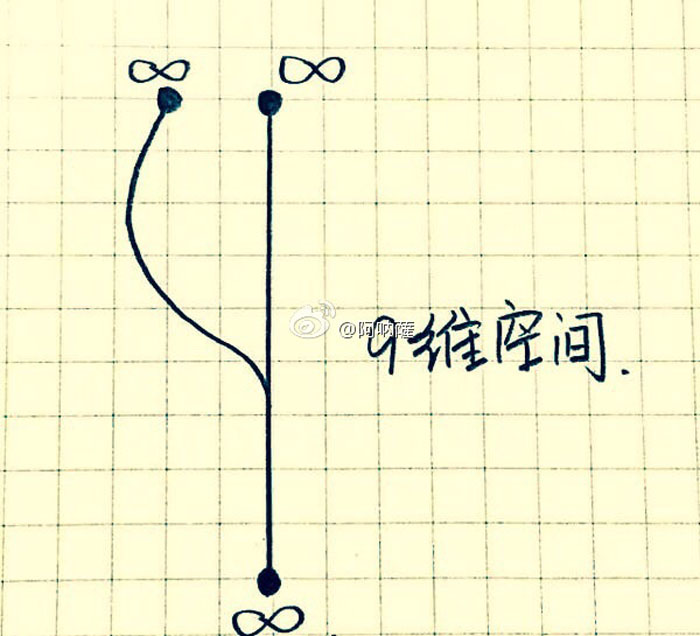 还记得文章开始时提到的一维的线么?我们把另外一条线穿过它,就变成了二维空间。同样的道理,我们来给七维空间升级。例子呢,还是那个“你”。我们又找到了两个点,一个是由“大学毕业的你”为开端产生的七维无限点,另一个是由“50岁的你”为开端产生的无限点。将这两点连线,与上文中那条连接“初中毕业的你”无限点“小学毕业的你”无限点的这条线相交。我们就得到了八维空间!