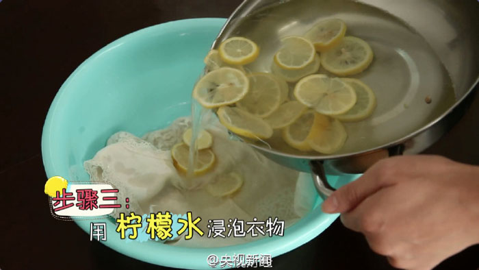 首先,将柠檬切片放进水中煮沸,再用煮好的柠檬水分别将两件衣服浸泡15分钟。15分钟再按照正常的洗衣步骤进行清洗。记者没费多大劲的揉搓了几下后,衬衫上面原本的汗渍黄斑已经消失了,而另一件整体发黄的衣服上的黄斑也在逐渐变淡。