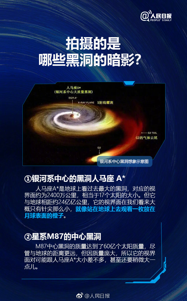 【天文学家捕获的首张黑洞照片公布】该黑洞图像揭示了室女座星系团中超大质量星系 Messier 87中心的黑洞。该黑洞距离地球5500万光年,质量为太阳的65亿倍。图中心的暗弱区域即为“黑洞阴影”。 (文字和图片来源@中科院之声)