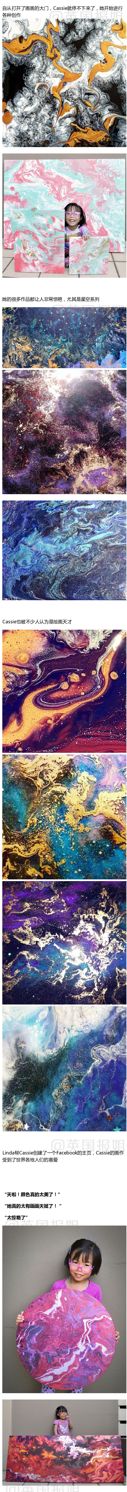 为了让活泼好动的女儿能安静会儿,妈妈给了她画布和颜料让她自己玩,却没料想到女儿手下的惊艳。而年仅5岁的小姑娘不只在绘画上很有天赋和才华,还懂得将自己画作的收入捐给世界各地的慈善机构。一个善良有爱的小画手。