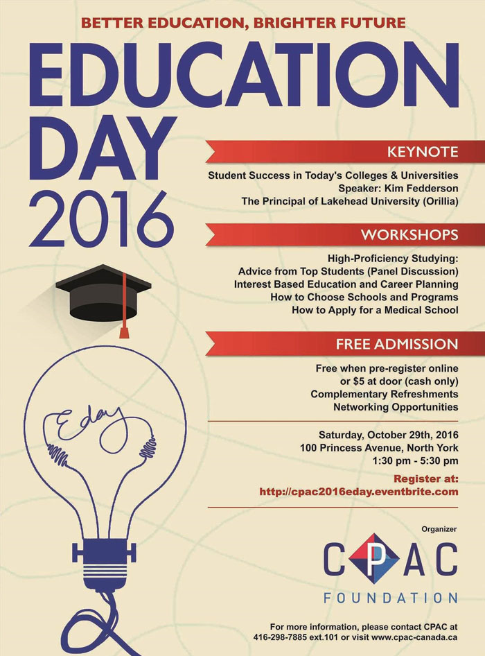 【加国生活网】CPAC基金会今天宣布:旨在为新移民家庭提供有关加拿大教育制度的信息和其他相关服务,帮助家长和学生在加拿大新生活中取得成功的年度教育盛会,第九届CPAC“教育日”活动将于2016年10月29日在北约克的一所公立高中内举行(地址:100 Princess Avenue, North York, ON M2N 3R7)。