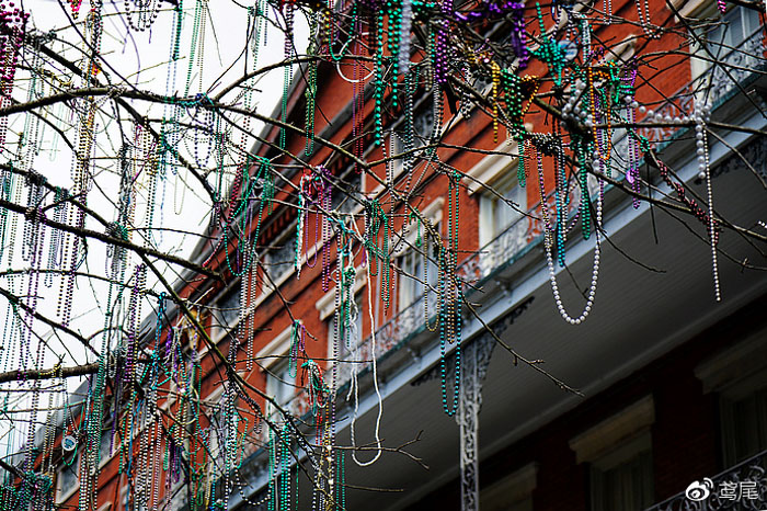 成立于1872年的Krewe of Rex确立了嘉年华的传统色彩:正义的紫色、信念的绿色、权利的金色。而以这三色塑料珠串成的Beads不仅仅是狂欢节的节日饰品,还有着一些很有趣的用法。花车游行时,你会听到大家狂喊“Throw me something, Mister!”,哄抢扔下来这些Beads。带着它们晚上去French Quarter吧,这是flash boobs或者秀腹肌时的“货币”。