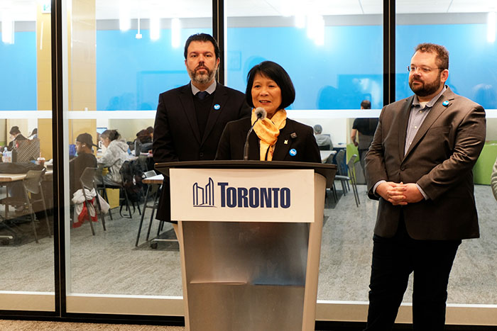市长邹至蕙、市议员万利高(左)及多伦多图书馆理事会副主席Jonathan Hoss在发布会现场