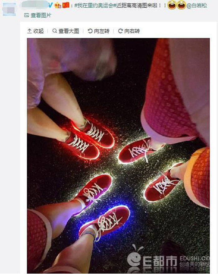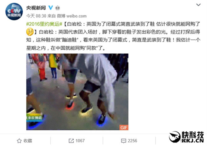 白岩松在介绍的时候的原话是这样的:英国代表团入场时,脚下穿着的鞋子发出彩色的光。经过打探后得知,这种鞋叫做“蹦迪鞋”,看来英国为了闭幕式,简直是武装到了鞋!我估计一个星期之内,在中国就能网购“同款”了。但这次白岩松错估了国内商家的敏锐度,“发光鞋”已经在售了……