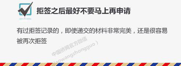文章来源:中国侨网啥?签证被拒了?!想知道为什么?接下来应该怎么办?出国,办签证,被拒签,听起来真让人心焦。为您总结了常见的几种被拒签的理由,以及拒签之后应该怎么办。希望对经常出国的人们有所帮助。