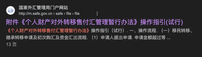 查阅国家外汇管理局门户网站就能发现,有一份文件叫《个人财产对外转移售付汇管理暂行办法》:
