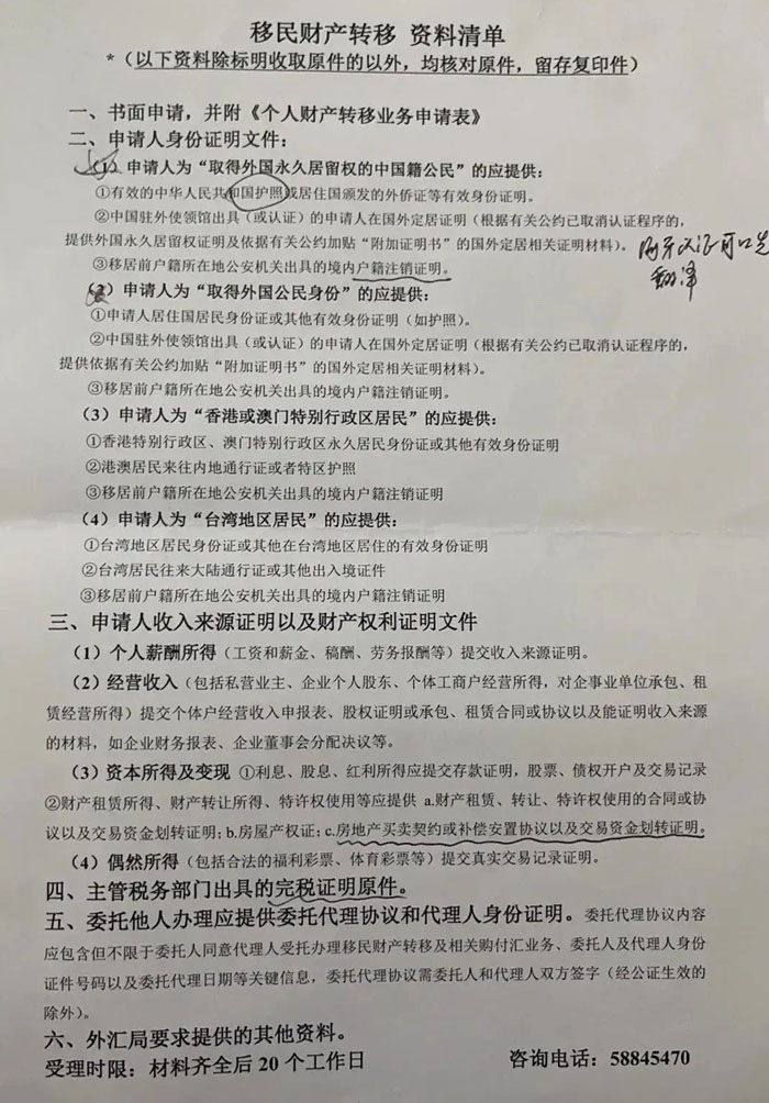 日前,来自中国上海的网友在社交媒体晒出一张“移民财产转移资料”清单,清单上的咨询号码就是外管局上海分局的公开电话。而这一张清单也瞬间打开了众多网友的心结,因为这张清单很清楚的表明,中国公民移民之后可以合法将自己的全部财产转移到移居国。