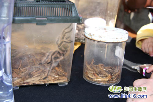 再仔细看她面前的盒子里,一边有一只大蜘蛛,一边还有一堆不知名的虫子,工作人员正在给孩子们讲解这些大自然中常见的生物。