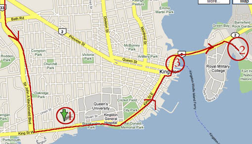 从多伦多沿高速401一直向东开,约两个小时左右,在615号口南下,走Sir John A. Macdonald Blvd,一直向南开至King St. W., 左拐,向东开至Centre St.再左转即是。见下图标号2的地点,这个路线的好处就是在去Fort Henry之前,还可以顺道游览一下Kingston小镇的风光。