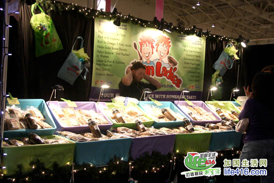 在这个展会中,有两行是专卖美食的,从各种酱料、三文鱼美食、肉类,到巧克力、养生茶、零食等,全部是用加拿大本地产的食品制作的。每个摊位都有免费的sample供大家品尝,因此也是最受欢迎的展区。
