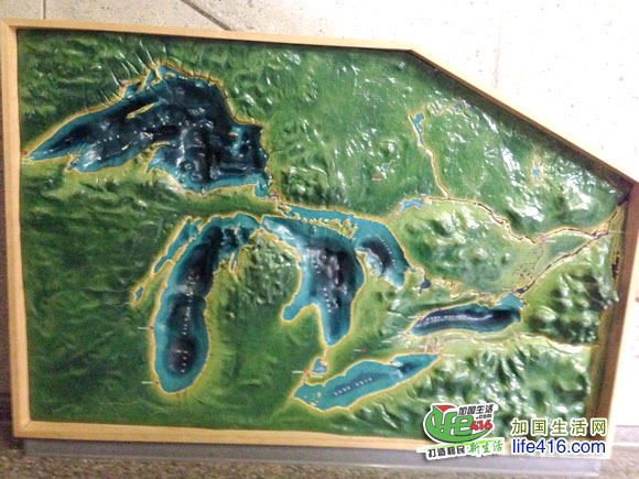 加拿大五大湖的缩影。找到安大略湖了没有?常去安大略湖的人们都会感叹这个湖浩瀚无边,哪能想到这个湖竟然是五大湖中最小的一个,看,最右边最小的那个就是哟。