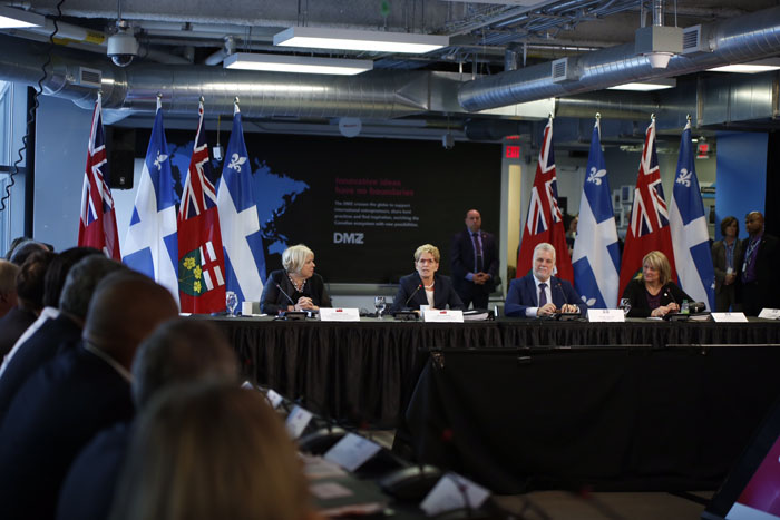 安省省长韦恩(中左二)与魁省省长库雅尔(中右二)与两省阁员举行联席会议。