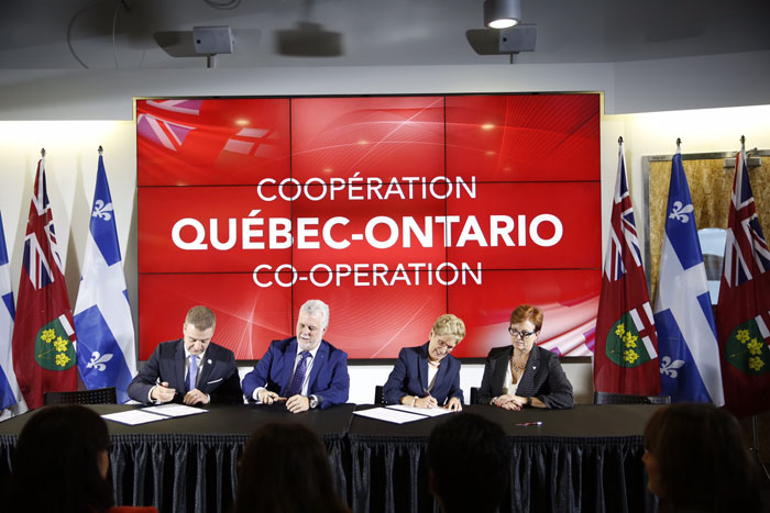 安省省长韦恩(右二)与魁省省长库雅尔(左二)签署协议。