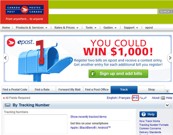加国生活网小编最新爆料:Canada Post 网站上查询包裹流程的网页又增加了多语言选项,其中包括“中文”(在输入跟踪号方框的右上角):http://www.canadapost.ca/cpo/mc/default.jsf